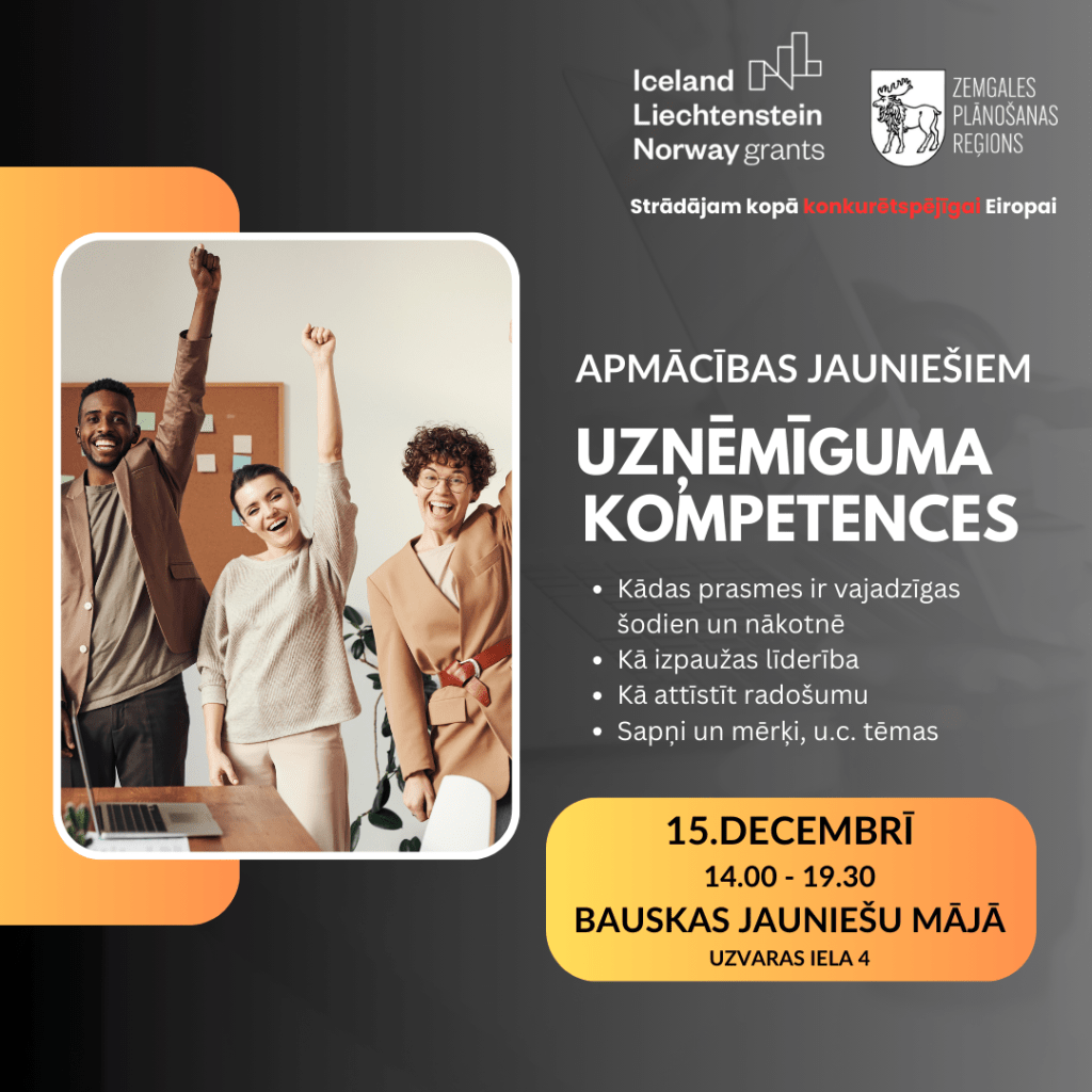 Zemgales plānošanas reģions projekta “Uzņēmējdarbība Zemgalē” ietvaros šī gada 15.decembrī organizēja jauniešiem Bauskas novadā apmācības par uzņēmīguma kompetencēm pēc “EnterComp” modeļa. Tā ietvaros profesionālu treneru pavadībā, dalībnieki individuāli un caur darbu grupās, pildot dažādus uzdevumus, meklēja atbildes uz jautājumiem kādas prasmes ir vajadzīgas šodien un kādas būs nepieciešamas tuvākā nākotnē, kas ir līderis un kas raksturo labu līderi, kā sevī raisīt radošumu, vai sava personiskā mērķa apzināšana palīdz ceļā uz sapņu sasniegšanu u.c.