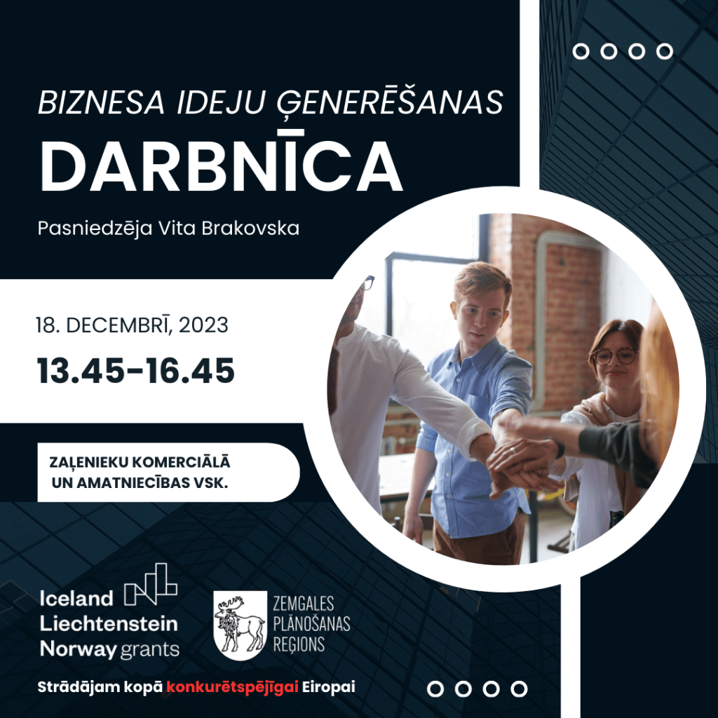 Jelgavas novadā Zaļenieku komerciālā un amatniecības vidusskolā projekta "Uzņēmējdarbība Zemgalē" ietvaros 18.decembrī notika biznesa ideju ģenerēšanas darbnīca. Tās laikā dalībniekiem bija iespēja iepazīt to, kas ir laba ilgtspējīga biznesa ideja, strādāt komandās un caur dizaina domāšanas pieeju attīstīt prasmes biznesa ideju ģenerēšanā.